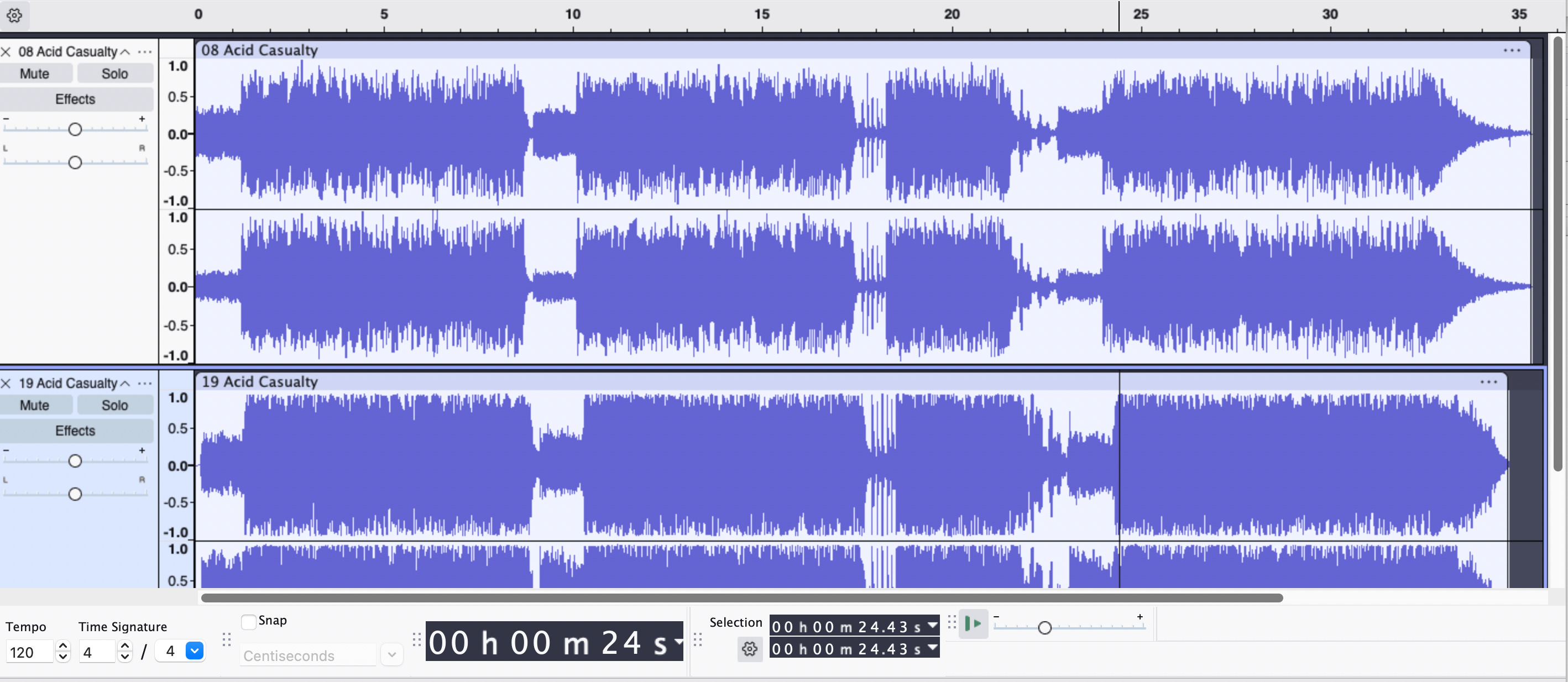 I put a 7” version (top) of “Acid Casualty” and the remastered version that was on the 2006 Sorry State release (bottom) into Audacity to line up the audio files. It doesn’t seem like anything is sped up to my eyes. You can see it’s mastered louder and the fade comes later on the newer version, but the songs seem to line up.